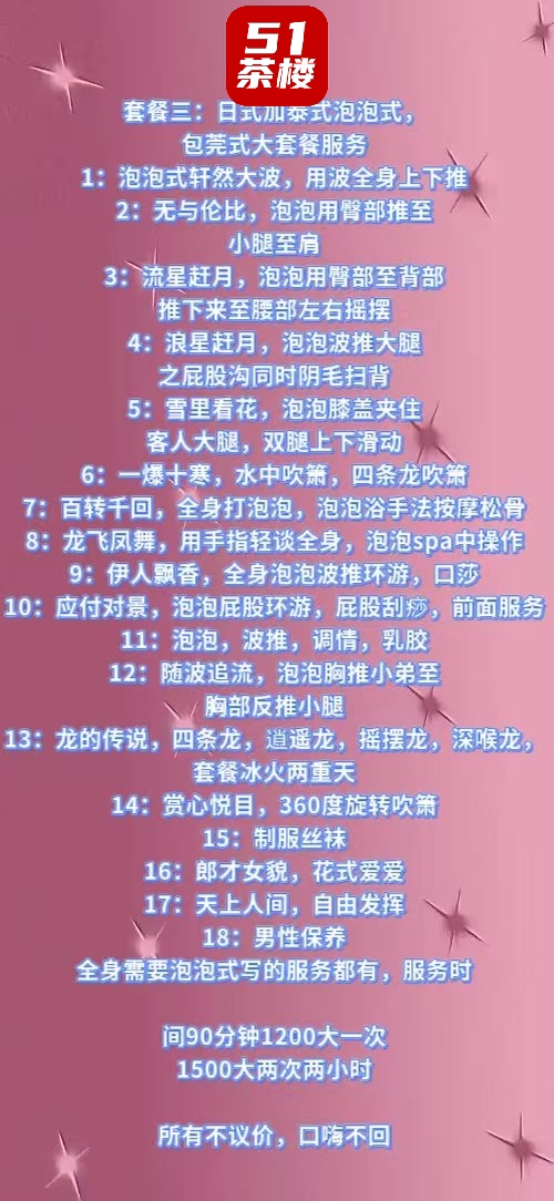 套餐B:包括a套餐所有服务4项第5,百转千回(背部打油,全身按摩推油,松腿)6,龙飞凤舞,用手轻谈全身7,随波追流,波推小弟至胸部单推小腿8,悦目赏心,360度旋转吹箫9,丝袜诱惑,高跟10,诱惑郎才女貌花式爱爱11,天上人间自由发挥服务时间60分钟,800有大